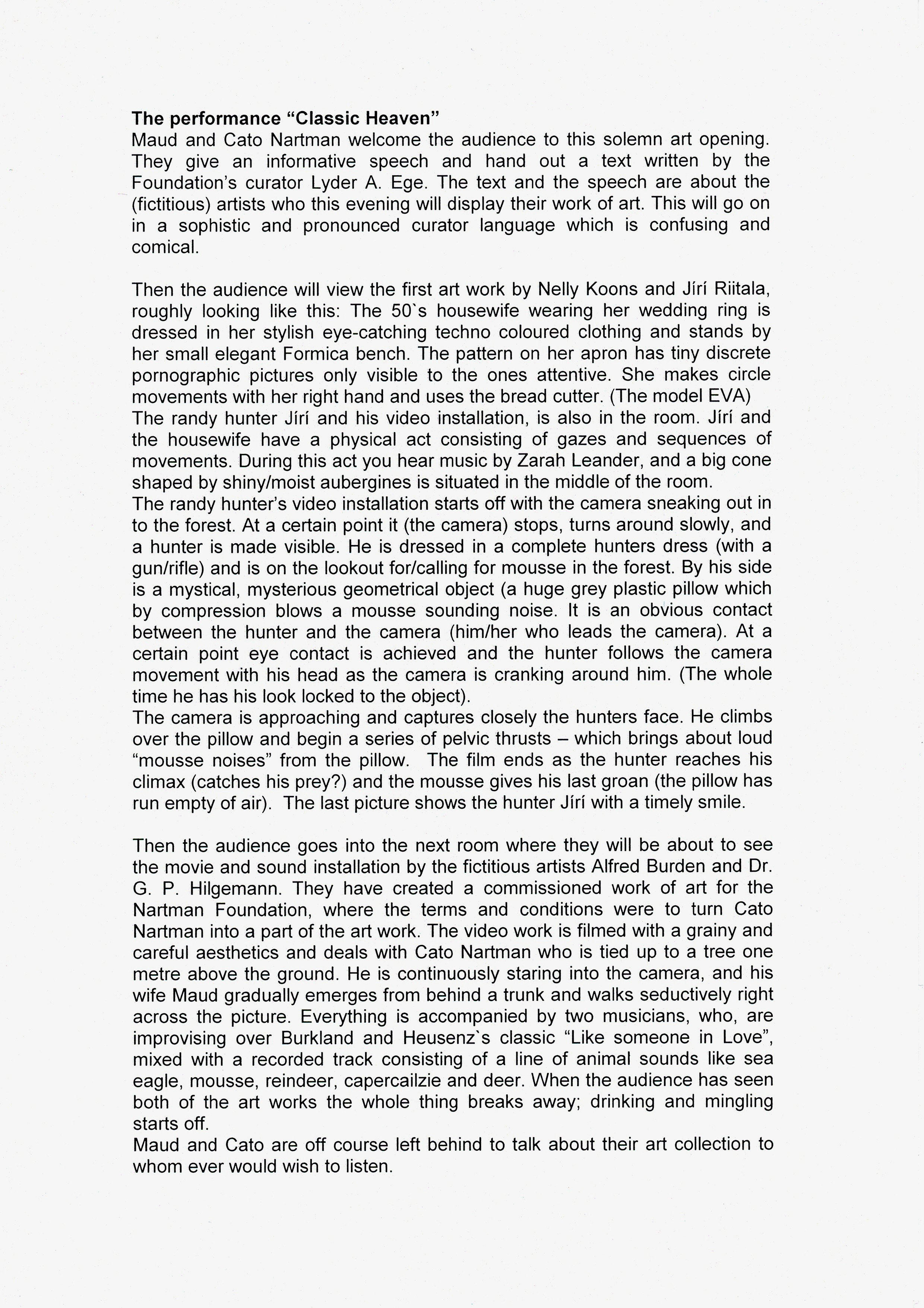 I oktober 2000 viste Pedersen med eminente utøvere en parodi på en kunstutstilling. I helgen fikk vi en videreutviklet versjon av suksessen. Fremdeles ubetalelig, morsom, spissformulert. Og dessverre fortsatt like aktuell etter tre år.